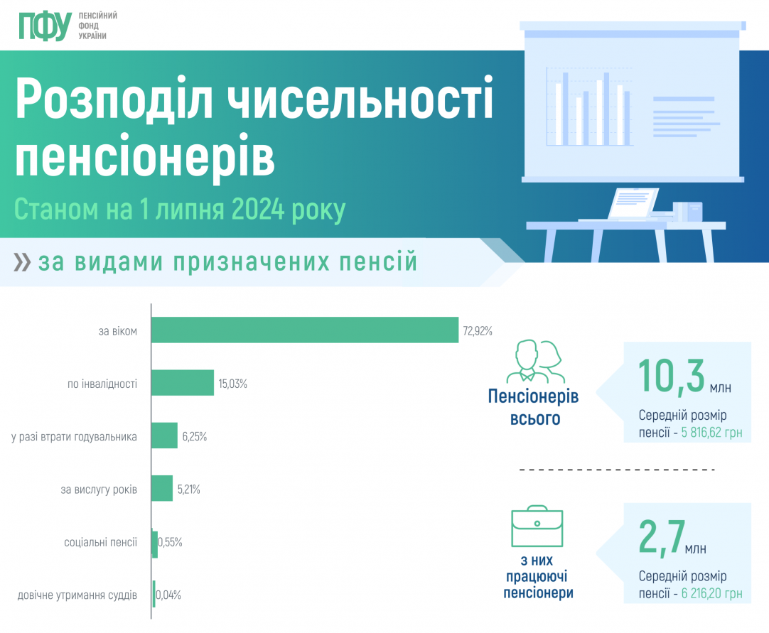 Станом на 1 липня 2024 року в Україні серед 10,3 млн пенсіонерів продовжували працювати 2,7 млн осіб.