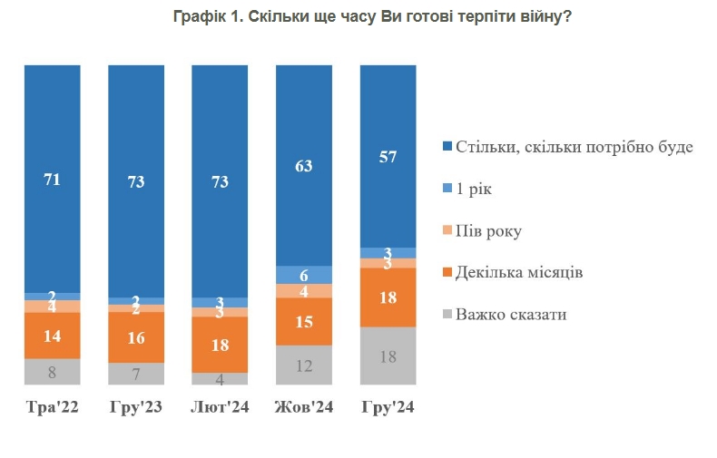 Водночас між лютим і жовтнем 2024 року вперше зафіксували зниження частки тих, хто готовий терпіти стільки, скільки буде потрібно - до 63%.