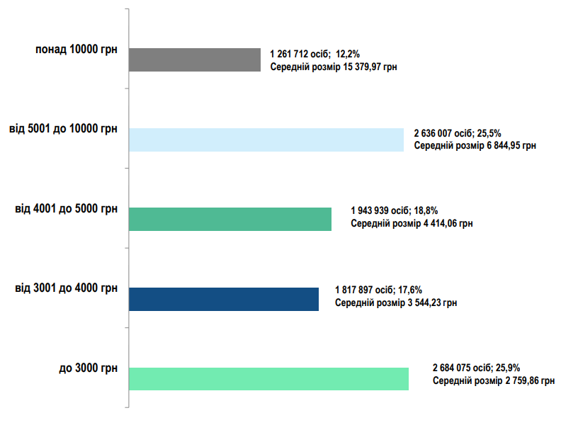 - понад 10000 гривень - 12,2%, 1 261 712 осіб, середня пенсія - 15 379,97 гривень.