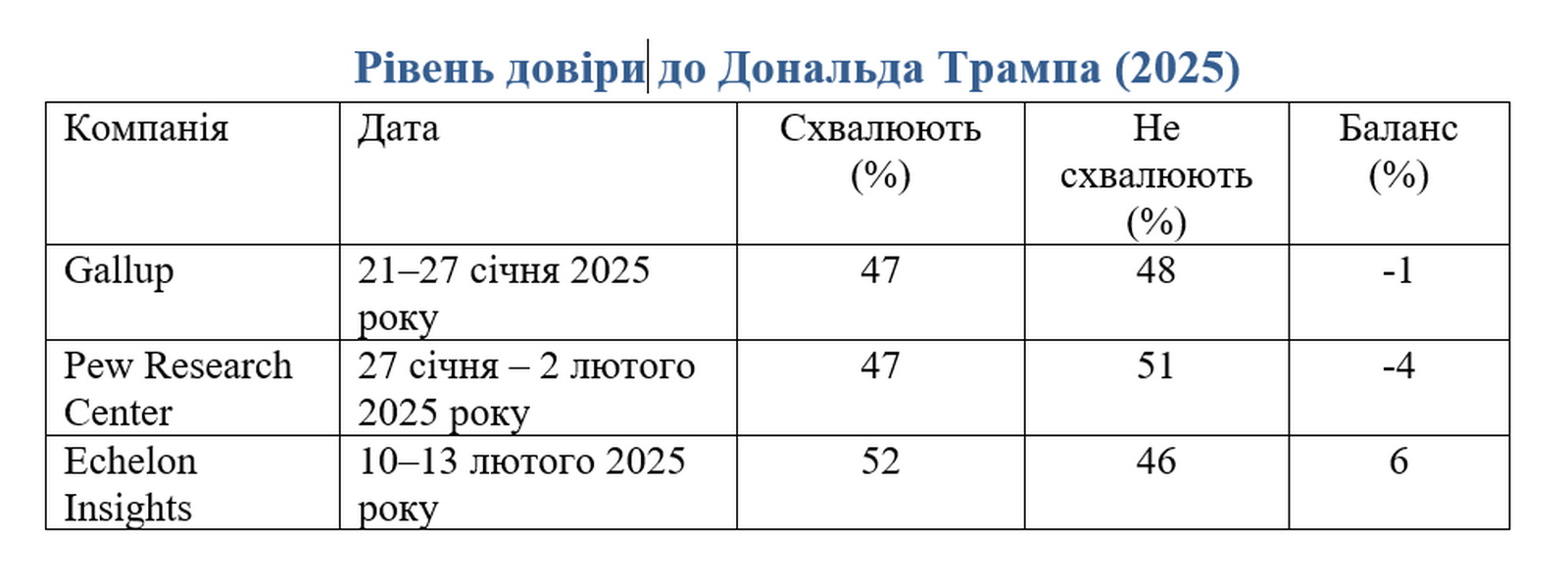 Крі того, директор КМІС Володимир Паніотто оприлюднив дані американських досліджень, за якими рейтинг Трампа в США нижчий, ніж рейтинг Зеленського в Україні. Схвалення його дій коливається в межах 47-52%, що є найнижчим показником для президента США з 1996 року.