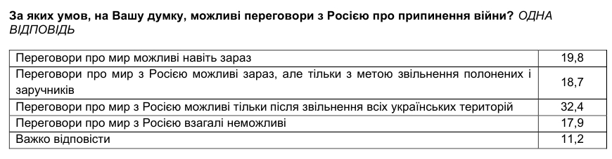 Близько третини українців (32,4%) вважають, що початок переговорів з Росією про припинення війни можливий лише після звільнення всіх українських територій.