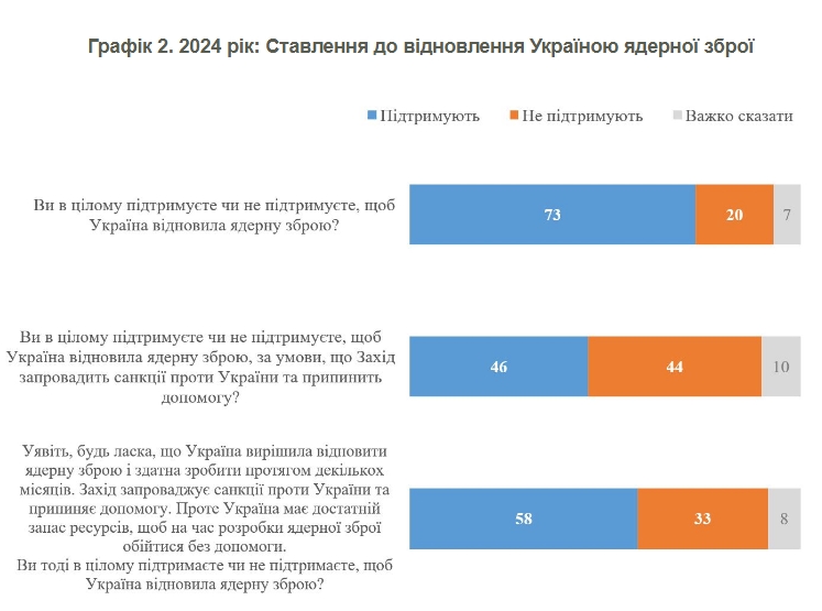 Проте якщо Україна має достатньо ресурсів протриматися до моменту отримання ядерної зброї, то 58% готові були би піти на втрату підтримки Заходу з метою отримання ядерної зброї. Не підтримали би рішення отримати ядерну зброю за такого сценарію - 33% (і решта 8% мають невизначені погляди).