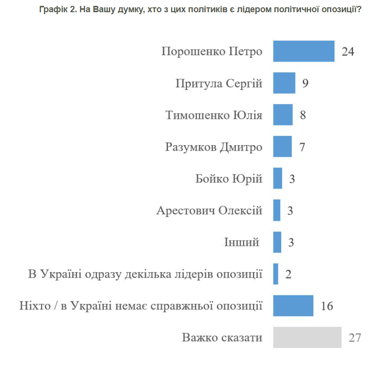 Також респондентам ставилося запитання, кого вони вважають лідером опозиції в Україні. Респондентам пропонувався список з шести публічних осіб або респонденти могли назвати свій варіант.