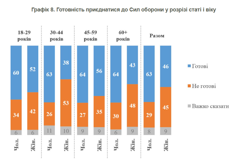 Серед чоловіків віком до 60 років більшість (60-64%) готові приєднатися до Сил оборони у разі потреби.