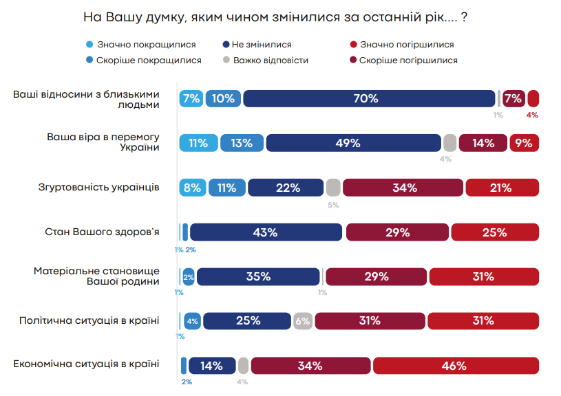 Як зазначають соціологи, перспективи розв’язання війни виглядають досить розмитими та невизначеними, люди перебувають в постійній напрузі. Незалежно від віку, статі та регіону, респонденти втомилися, відчувається багато апатії. Визнають, що бойове піднесення, яке виникло на початку війни, наразі дещо згасло.