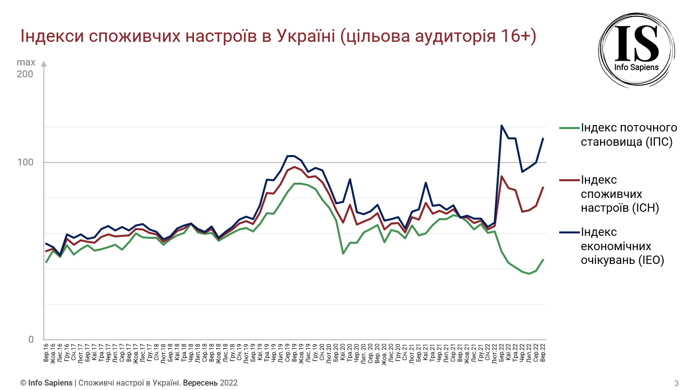 У вересні 2022 року Індекс споживчих настроїв в Україні склав 86,0 пунктів, що на 10,5 пунктів вище за показник серпня. Зросли усі складові індикатора.