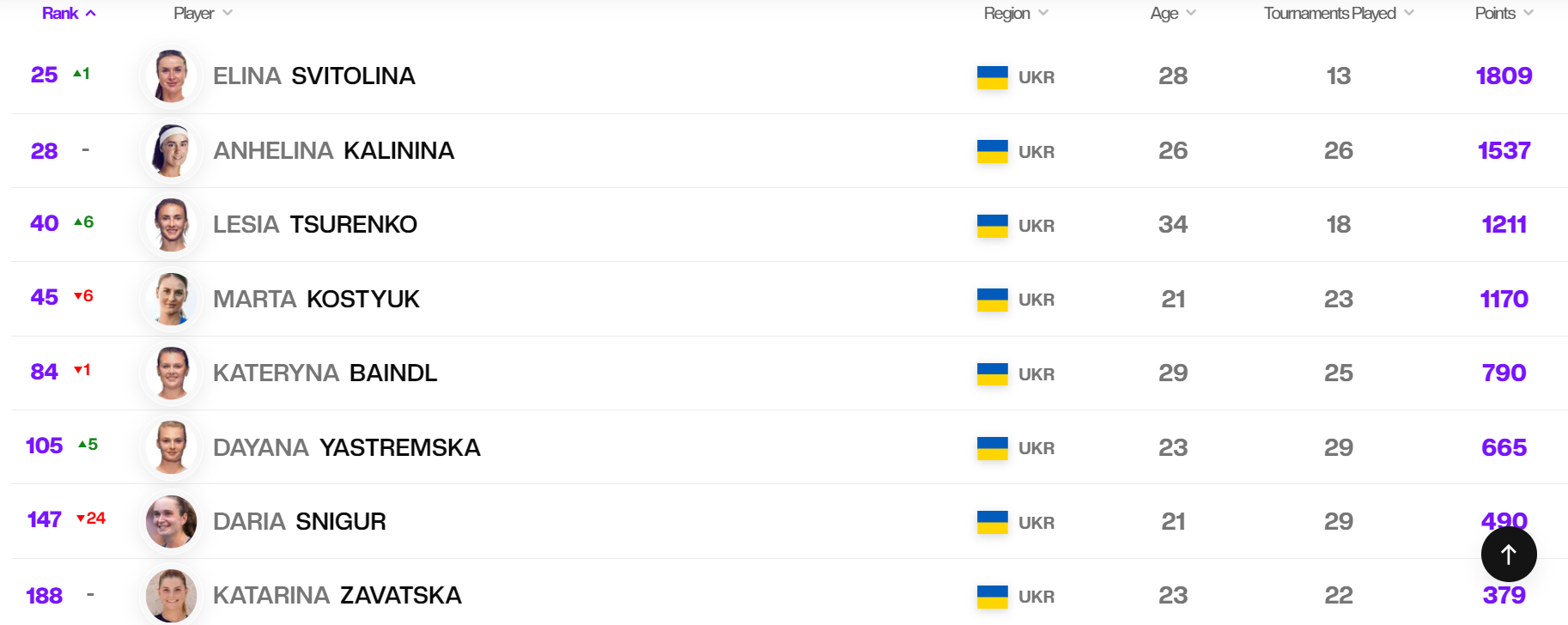Натомість просунулася вгору досвідчена Леся Цуренко. 34-річна українка стрибнула вгору на шість сходинок і тепер посідає 40-ве місце. Також у першій сотні рейтингу залишилася Катерина Байндль (84-та сходинка). Наблизилася до топ-100 Даяна Ястремська (+5 позицій, 105-те місце).