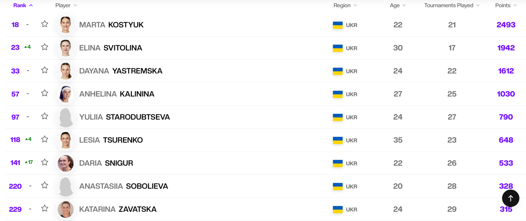 Залишається в топ-100 Юлія Стародубцева. Вона не виходила на корт із кінця жовтня, але зберегла 97-ме місце в класифікації WTA. Прагнуть скласти компанію співвітчизницям у першій сотні Леся Цуренко та Дарія Снігур. Перша піднялась на чотири сходинки, а друга – на цілих 17.