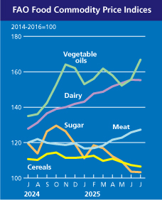 Світові ціни на продовольство зросли в липні 2025 року. Підвищення відбулося на тлі зростання цін на м'ясо та рослинні олії, попри зниження цін на зернові, молочні продукти та цукор.