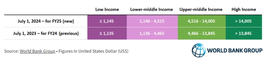 У поточному фінансовому році 2025 року країни з низьким рівнем доходу визначаються як країни з ВНД на душу населення, розрахованим з використанням методу Світового банку, у розмірі 1145 доларів або нижче в 2023 році; країни з рівнем доходу нижче середнього – це країни з ВНД на душу населення від 1146 до 4515 доларів; країни з рівнем доходу вище за середній - це країни з ВНД на душу населення від 4516 до 14 005 доларів; Країни з високим рівнем доходу – це країни з ВНД на душу населення понад 14 005 доларів.