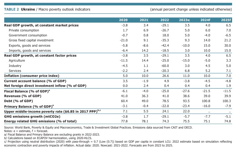 За даними банку, ВВП України почав відновлюватися, причому у другому кварталі 2023 зростання стало позитивним вперше після російського вторгнення. Цьому сприяло державне споживання та помірне відновлення пропозиції у секторах, пов'язаних із підтримкою військової економіки, а також у тих, що отримують вигоду від покращення постачання електроенергії.