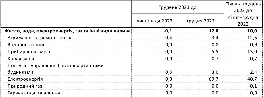 Середні ціни на житло, воду, електроенергію, газ та інші види палива в Україні за 2023 рік зросли на 12,8%.