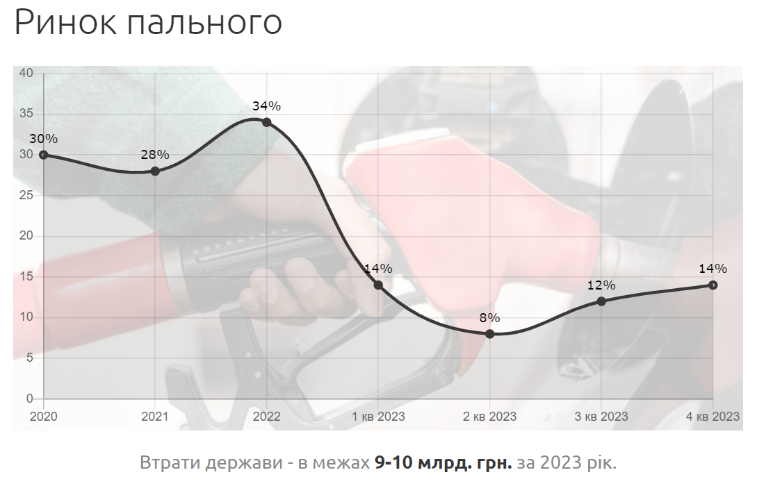 Відповідно до розрахованих даних, у 2023 році втрати бюджетів від несплати податків з пального ("чорні" продажі + мінімізація податків мережами) склали 9-10 млрд гривень за рік.