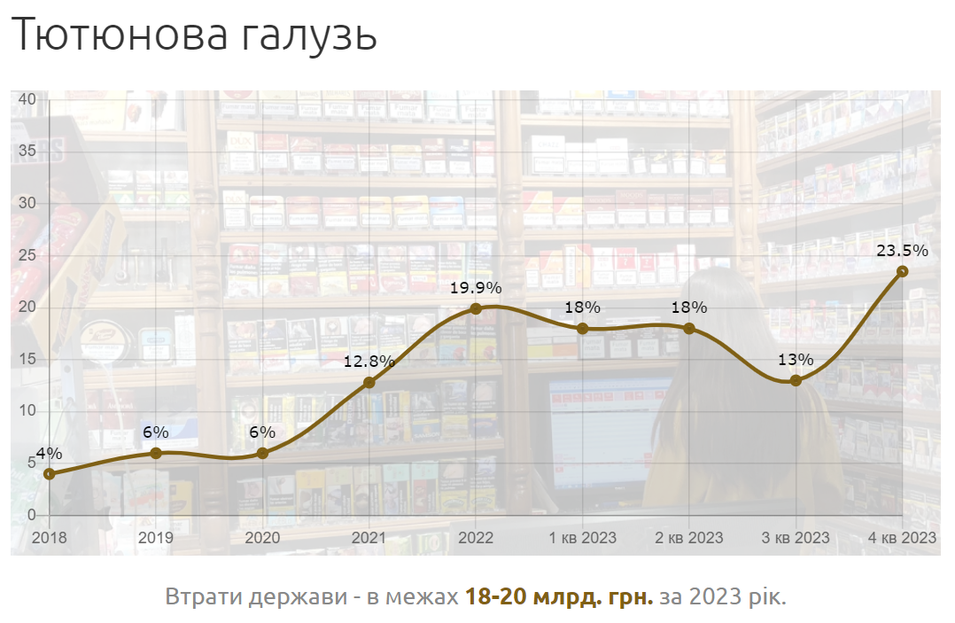 Втрати бюджетів від несплати податків з табачної продукції склали 18-20 млрд у 2023 році.