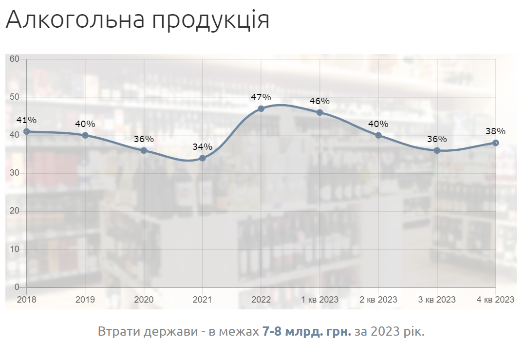 Загальний рівень споживання алкогольних напоїв у 1 кварталі 2024 року відповідно до розрахунків оцінюється на рівні 8,82 літру чистого етилового спирту на одну особу. Відповідно, рівень тіньового споживання - на рівні 3,65 літру (відповідає 41% ринку). Це завдає втрат бюджету в середньому 7-8 млрд грн на рік.