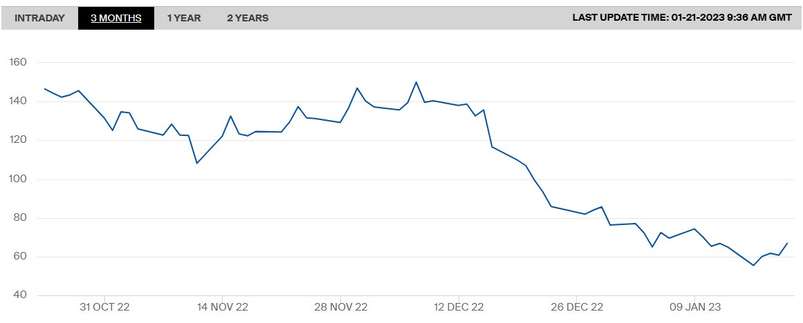 Ціни на природний газ у Європі показали перше тижневе зростання з початку грудня. Ціна на хабі TTF у Нідерландах у п'ятницю, 20 січня, піднялася на 10% до 67 євро за мегават-годину (близько 760 доларів за тисячу кубометрів).