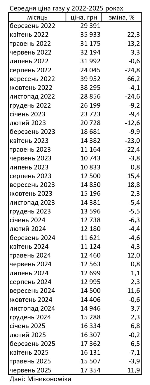 За даними міністерства, фактична ціна реалізації газу в Україні в червні 2025 року зросла на 11,9% до 17 354 гривень за 1 тис. кубометрів без ПДВ.