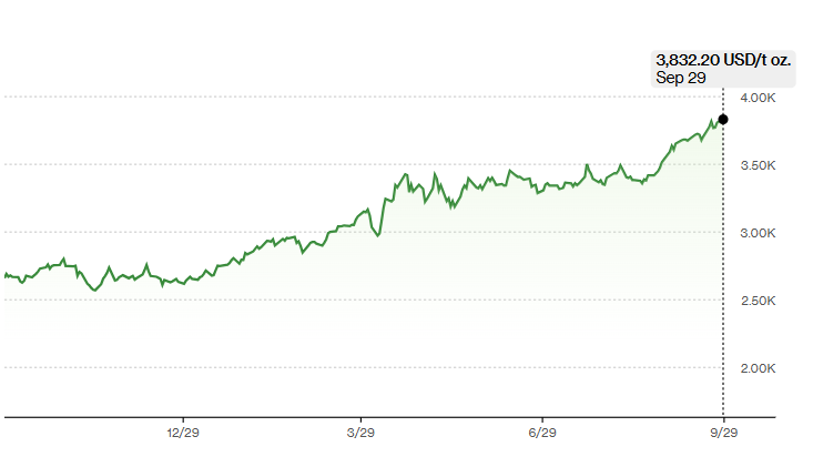 Ціни на золото вперше перевищили 3 800 доларів за унцію. Підвищення пов'язане зі зростанням очікувань зниження ставок Федеральної резервної системи США, що послабило долар.