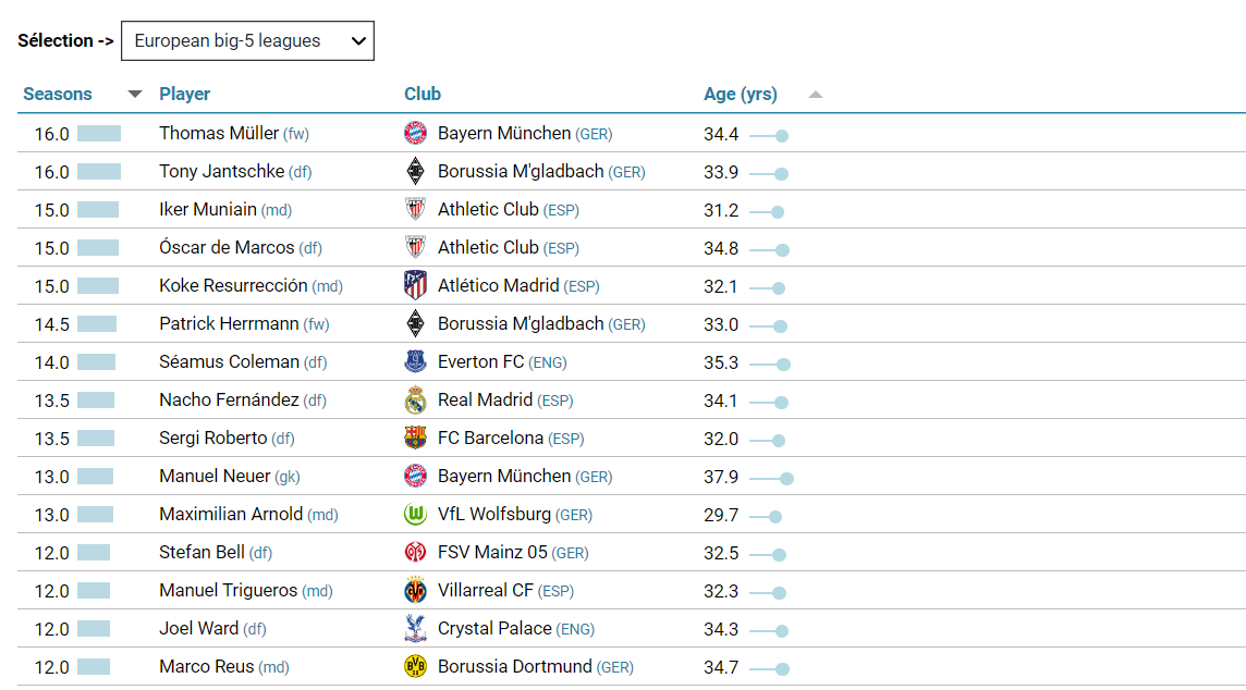 Мюллєр випередив оборонця "Боруссії" з Менхенгладбаха Тоні Ячке. У лавах "жеребців" він виступає ті ж 16 сезонів. На рік менше в складі "Атлетіка" з Більбао провели Ікер Муньяїн і Оскар де Маркос (по 15 сезонів). Замкнув топ-5 капітан мадридського "Атлетіко" Коке (15 сезонів).