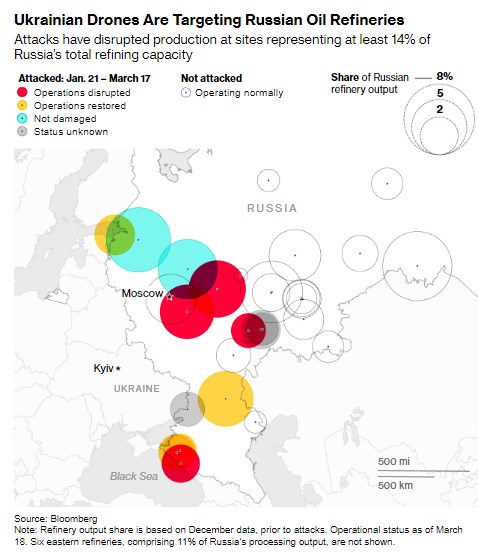 Удари українських дронів по російським НПЗ знаменують новий етап війни, - Bloomberg