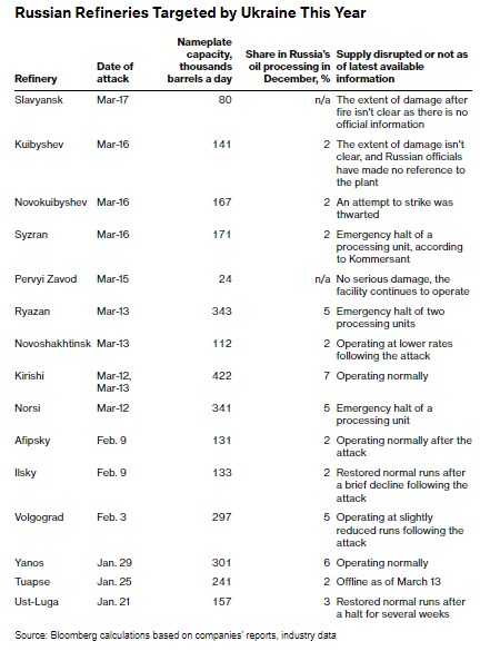 До середини лютого внаслідок атак дронів було пошкоджено п'ять нафтопереробних заводів. Відразу після цього Росія заборонила експорт бензину з 1 березня по 31 серпня, щоб забезпечити достатні внутрішні постачання напередодні сезонного зростання попиту.