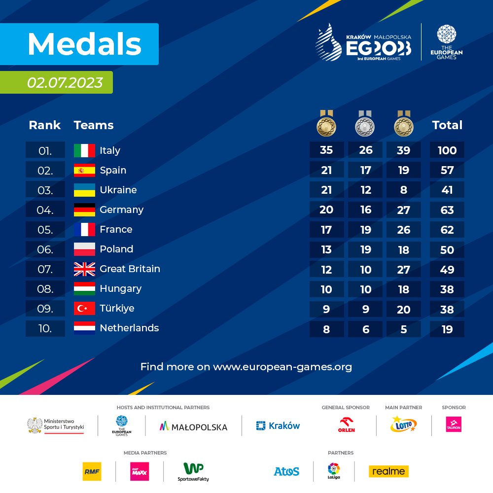 Збірна України за весь турнір виграла 21 золоту, 12 срібних і 8 бронзових медалей. Такий результат дозволив "синьо-жовтим" посісти третє місце в командному заліку. Безумовним лідером класифікації стала Італія – 100 нагород, із яких золотих – 35. Другими стали іспанці, які випередили українців завдяки більшій кількості "срібла" (17 проти 12-ти).