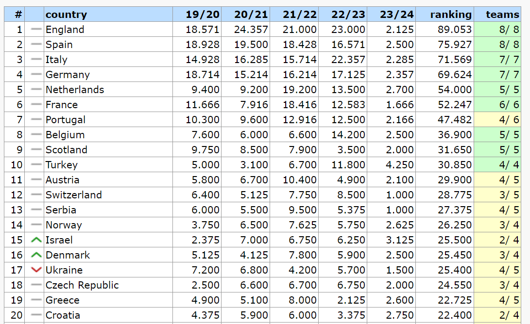 Ізраїль і Данія випередили її завдяки вдалішим виступам тамтешніх команд. Тепер вони набрали 25,500 та 25,450 балів відповідно. Натомість Чехія, яка іде на 18-й позиції, відстала від України всього на 0,850 бала.