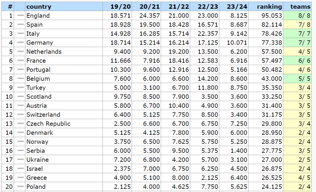 Загалом Україна набрала 27,000 балів. Позаду залишився якраз Ізраїль (26,875). І хоч тамтешні команди здобули теж одну перемогу на двох ("Маккабі" з Хайфи програв іспанському "Вільярреалу" в Лізі Європи), але скоротили відставання. Так сталося через різну кількість представників у євротурнірах.