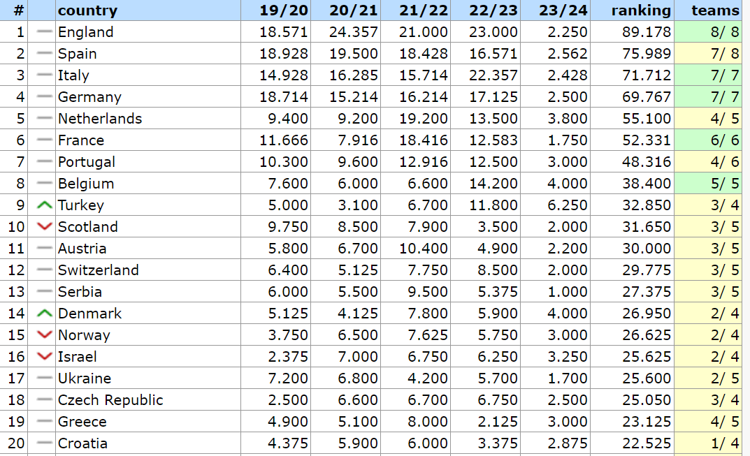 Україна залишилася на 17-й сходинці в європейській класифікації. Ще два тижні тому вона перебувала на 15-й позиції, але невдалі виступи луганської "Зорі", "Дніпра-1" та київського "Динамо" викликали регрес.