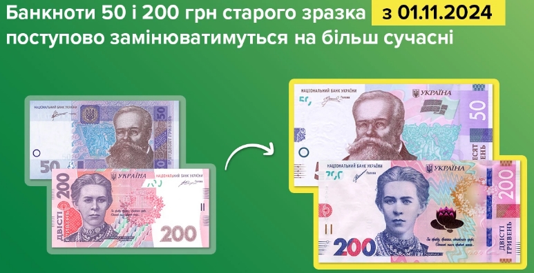 Національний банк України з 1 листопада розпочне поступове вилучення з обігу банкнот номіналами 50 та 200 гривень зразків 2003-2007 років. Їх мінятимуть на банкноти аналогічних номіналів сучасного покоління випуску після 2014 року.