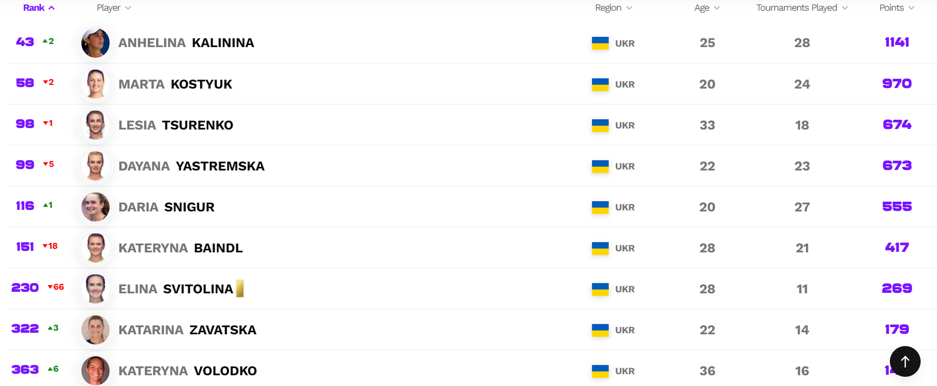 Співвітчизниці Калініної з топ-100 втратили позиції. Зокрема, Марта Костюк втратила дві сходинки та опустилася на 58-ме місце. Ще гірші справи в Лесі Цуренко (98-ме) та Даяни Ястремської (99-те).