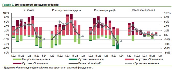 У січні - березні 2024 року більшість українських банків очікує зниження вартості всіх депозитів. На здешевлення коштів корпорацій очікують 69% респондентів, а коштів населення - 50%.