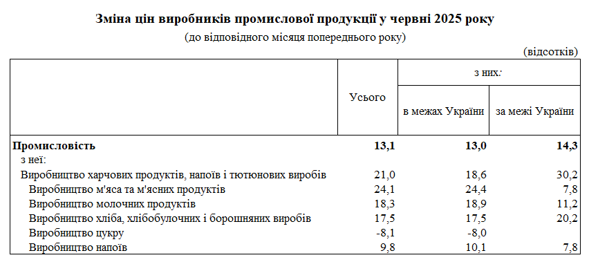 За даними статистичного відомства, в червні 2025 року оптові ціни виробників промислової продукції порівняно із червнем минулого року зросли на 13,1%. Ціни в межах України зросли на 13,0%, за межі України - на 14,3%.