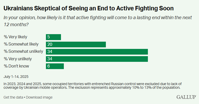 Згідно з опитуванням, проведеним 1-14 липня, кожен четвертий (25%) вважає, що активні бойові дії, імовірно, припиняться протягом наступних 12 місяців, хоча лише 5% вважають це "дуже ймовірним".