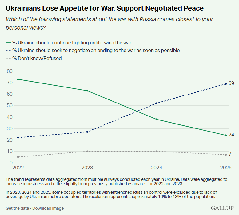 У публікації Gallup йдеться, це зрушення відбувається на тлі нової активізації дипломатичних зусиль. Президент України Володимир Зеленський заявив про готовність до прямих перемовин із Володимиром Путіним, запропонувавши відновити переговори, в той час як президент США Дональд Трамп намагається чинити тиск на Кремль, погрожуючи санкціями, йдеться в публікації.