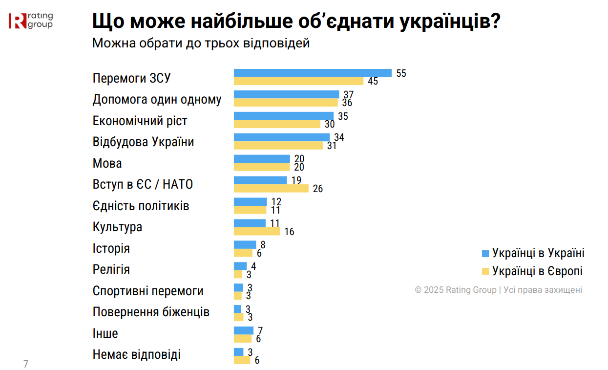 За даними опитування, головним фактором єднання є перемоги Збройних сил України. Це відзначили 55% громадян, які залишаються в країні, та 45% українців у Європі.