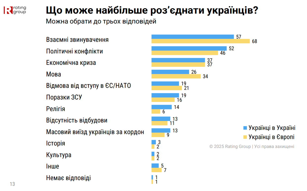 Натомість найбільше роз’єднувати суспільство можуть взаємні звинувачення (57%), політичні конфлікти (52%) та економічна криза (37%). Українці за кордоном частіше за інших вказують на взаємні звинувачення (68%) та мовні питання (34%).