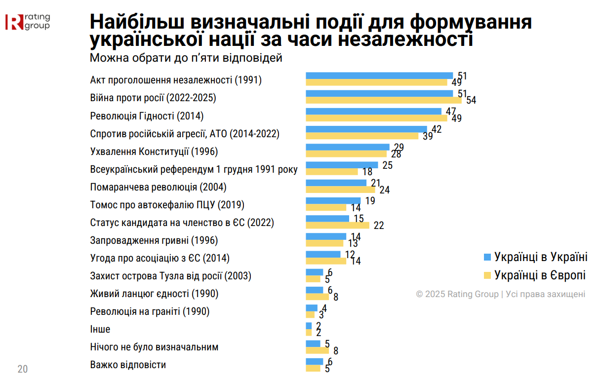 Серед ключових подій, що формували сучасну націю, респонденти найчастіше згадували проголошення незалежності у 1991 році (51%), опір російській агресії після 2022 року (51%), Революцію Гідності (47%) та події АТО/ООС (42%).