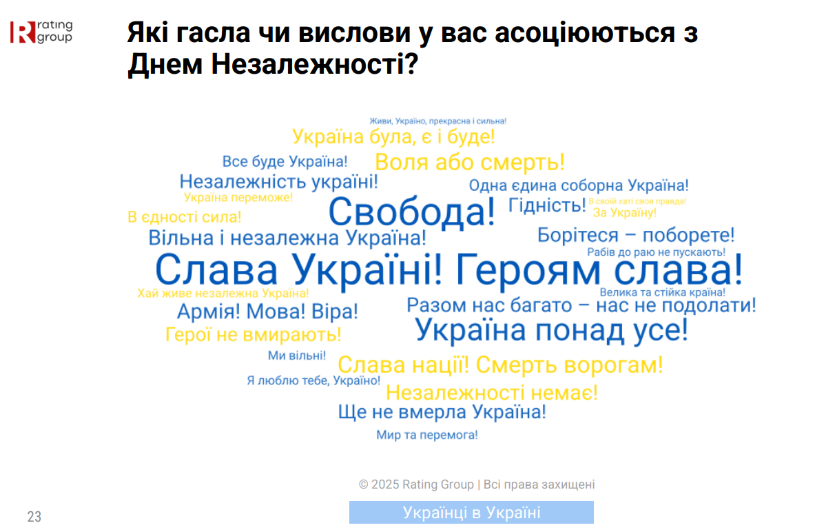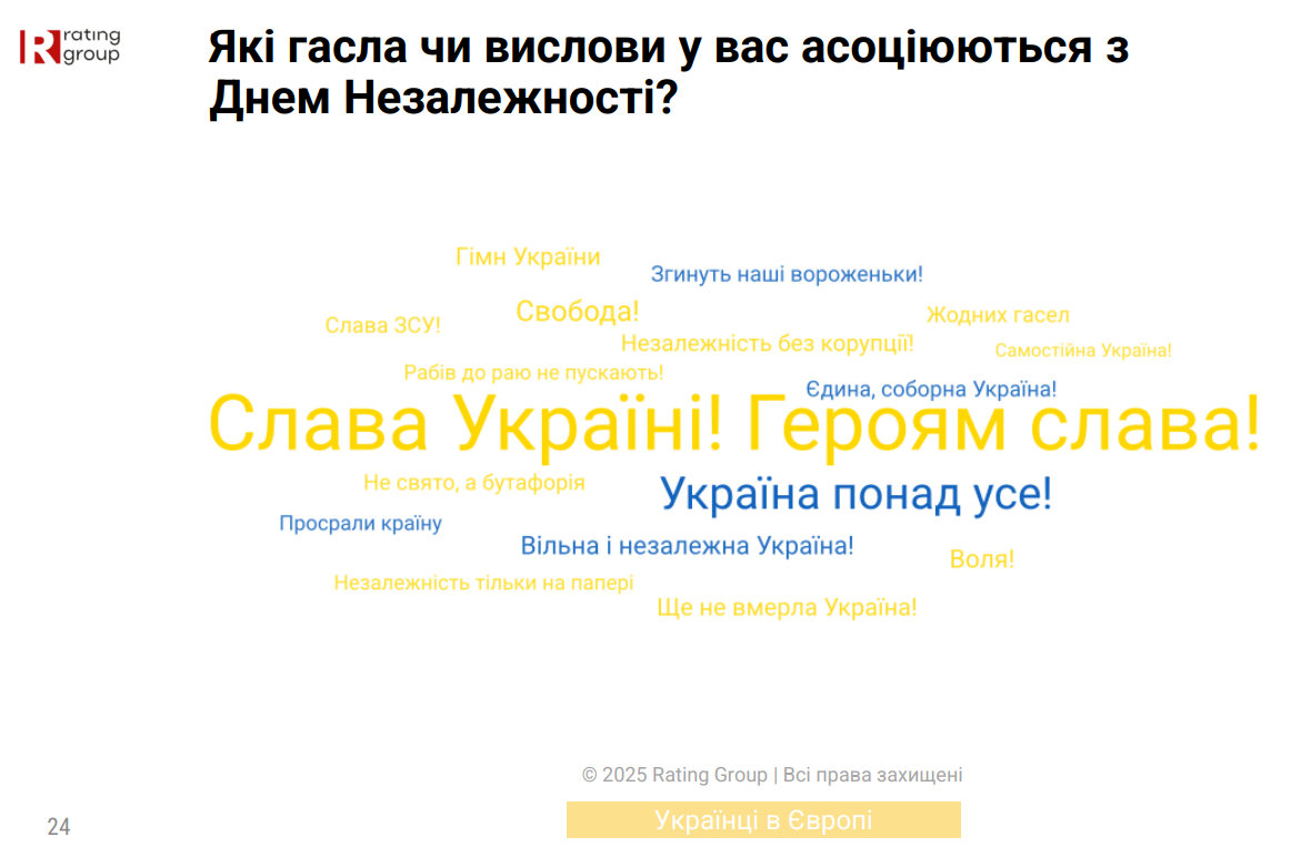 Найбільш поширеною асоціацією з Днем Незалежності стало гасло "Слава Україні! Героям слава!".