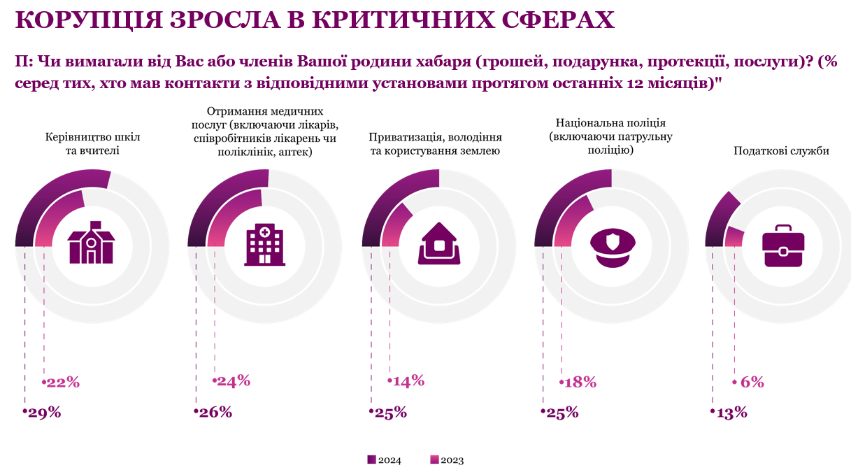Зокрема, 29% респондентів заявили, що керівництво шкіл та вчителі вимагали від них або членів родини хабаря (грошей, подарунка, протекції, послуги) протягом останніх 12 місяців.