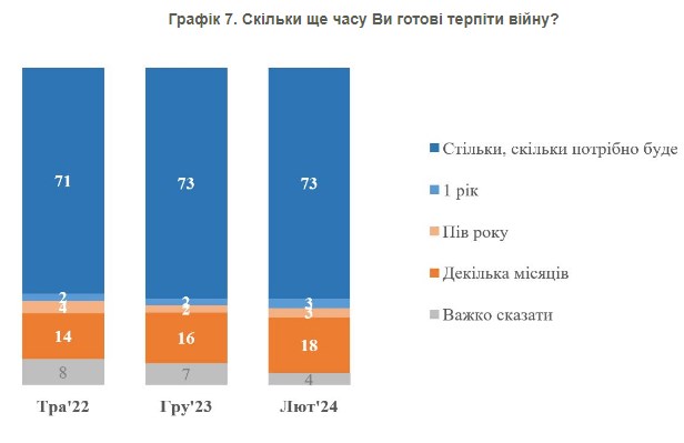 За даними опитування, 73% українців стверджують, що готові терпіти війну стільки, скільки буде потрібно (плюс 3% готові терпіти ще досить довго - рік). Разом з цим 3% готові терпіти ще пів року, а лише декілька місяців - 18%.