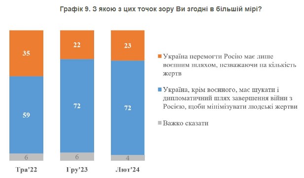 У лютому 2024 року 72% респондентів погоджувалися з думкою, що Україна має шукати і дипломатичний шлях завершення війни (у формулюванні запитання йшла мова просто про такий процес, а не про поступки).