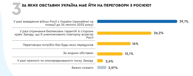 Майже 40% опитаних вважає, що Україна має йти на переговори лише тоді, коли Росія виведе свої війська (принаймні на позиції до 24 лютого 2022 року). Ще 26,2% українців впевнені, що передумовою для перемовин мають стати безпекові гарантії зі сторони країн Заходу, що б унеможливило повторну агресію.