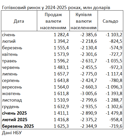Населення України в березні 2025 року продало комерційним банкам готівкової та безготівкової валюти на 1,625 млрд доларів (в еквіваленті) і купило на 2,345 млрд доларів. Чиста купівля валюти склала 720 млн доларів.