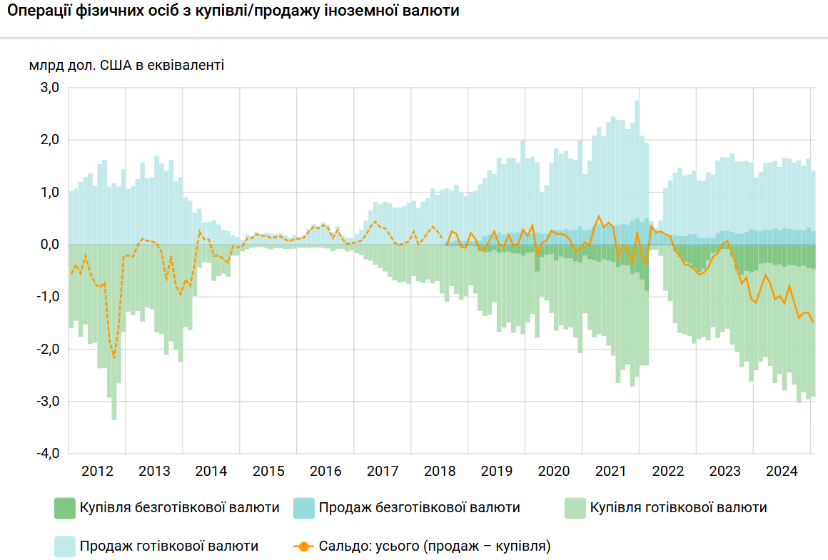 Населення України в січні 2025 року продало комерційним банкам готівкової та безготівкової валюти на 1,411 млрд доларів (в еквіваленті) і купило на 2,891 млрд доларів. Чиста купівля валюти склала 1,480 млрд доларів.