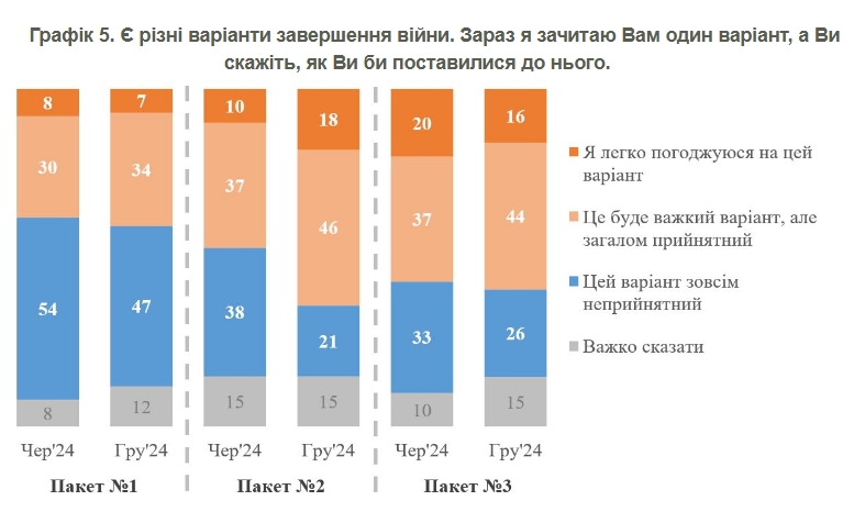 У грудні 2024 року українці лишаються гнучкими і відкритими до дискусій щодо параметрів мирних домовленостей. Але однозначно не згодні на "мир на будь-яких умовах".