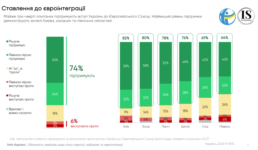 Опитування показало, що ідею вступу України до ЄС підтримує 74% громадян. Найвищий рівень підтримки зафіксовано у Києві (82%), на Заході (80%), Півночі (78%) та в Центрі (76%).