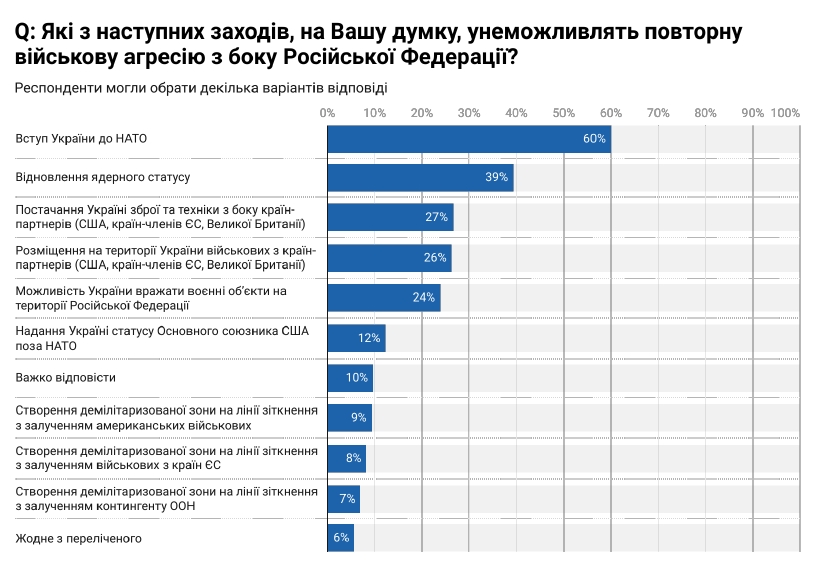 Більшість українців (60%) вважають, що унеможливити повторну військову агресію з боку Росії здатен вступ України до НАТО. Варіант відновлення ядерного статусу обрали 39%.