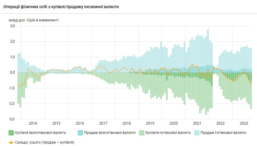 Населення України в жовтні 2023 року продало комерційним банкам готівкову та безготівкову валюту на 1,590 млрд доларів (в еквіваленті) і купило на 2,330 млрд доларів. Чиста купівля валюти склала 739,4 млн доларів.