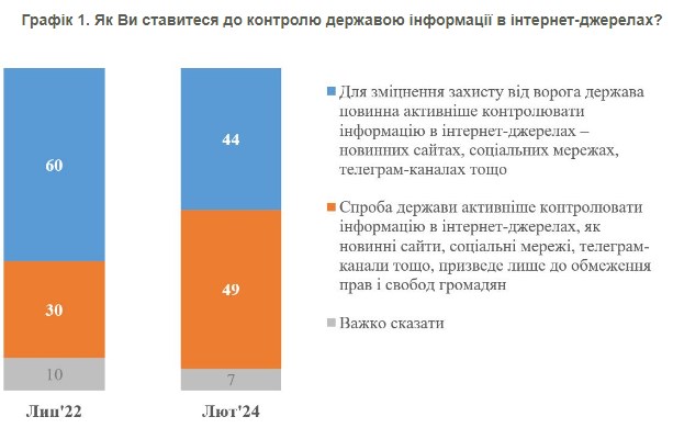 У лютому 2024 року лише 44% українців погоджувалися, що для зміцнення захисту від ворога держава повинна активніше контролювати інформацію в інтернет-джерелах. У липні 2022 року з цим були згодні 60%.